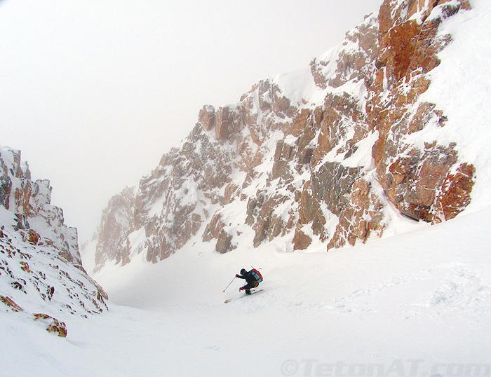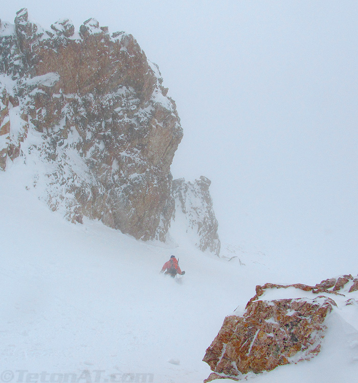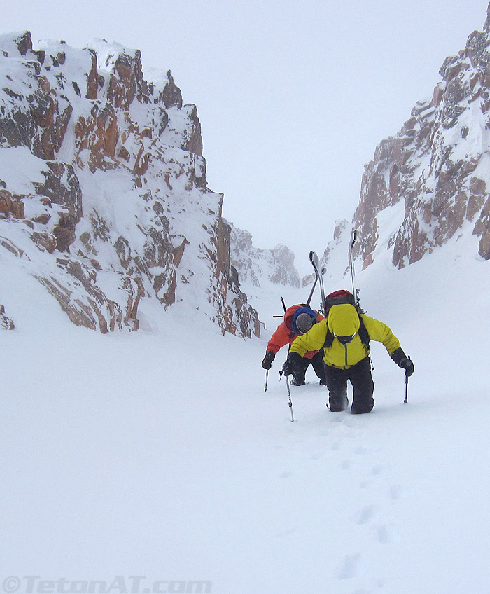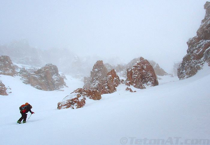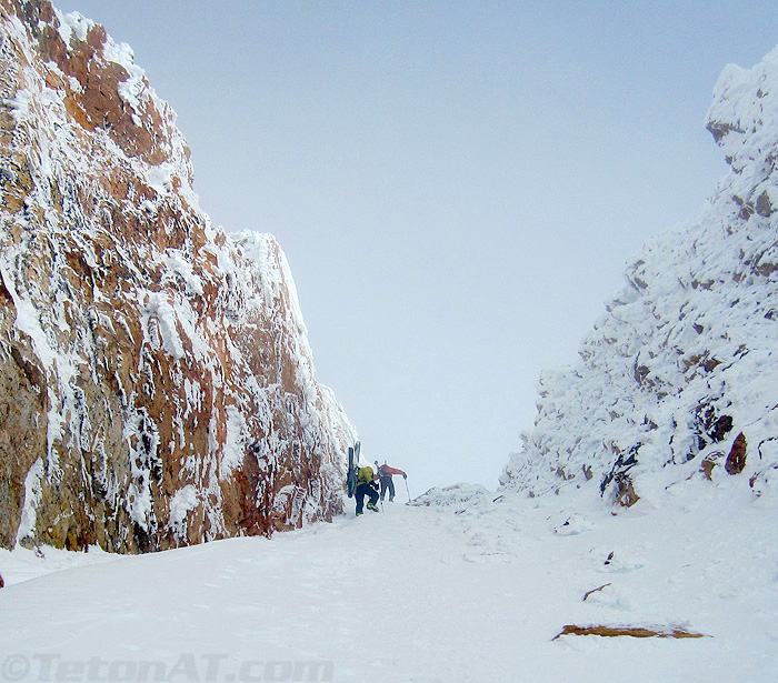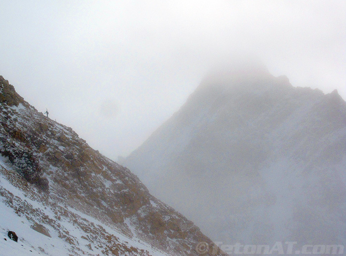 We eventually made it to the bottom of the couloir and it looked in good shape, so we skinned higher and then booted when things got slick. I think the couloir is skiable from the summit (or can be connected to from the summit), but considering the weather, we decided that the col at the top was sufficient and called it quits there, hoping to come back from another shot at a complete descent another day.