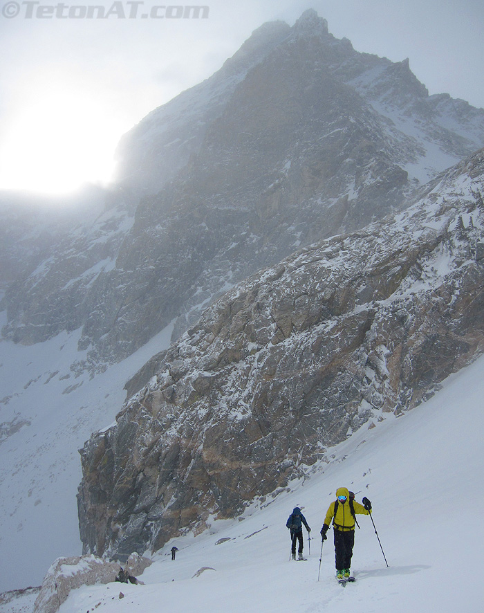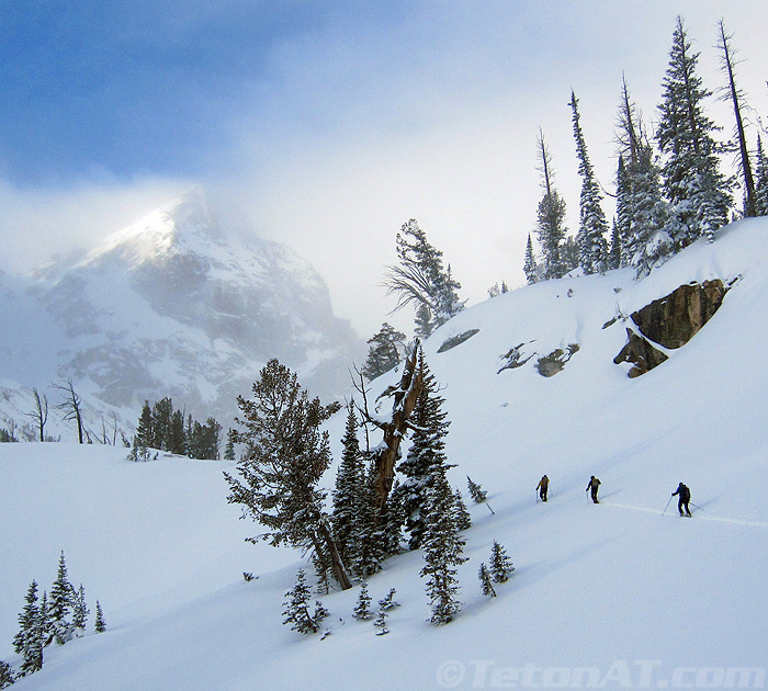 A dawn time start under cloudy skies with -10F temps had us wondering what the day would bring as we skinned across Taggart Lake. To keep warm, we kept moving and made it to Lake Taminah in good time, but where we though we’d be greeted by some sunshine, we were unfortunately welcomed by stiff winds and -30F wind chills.