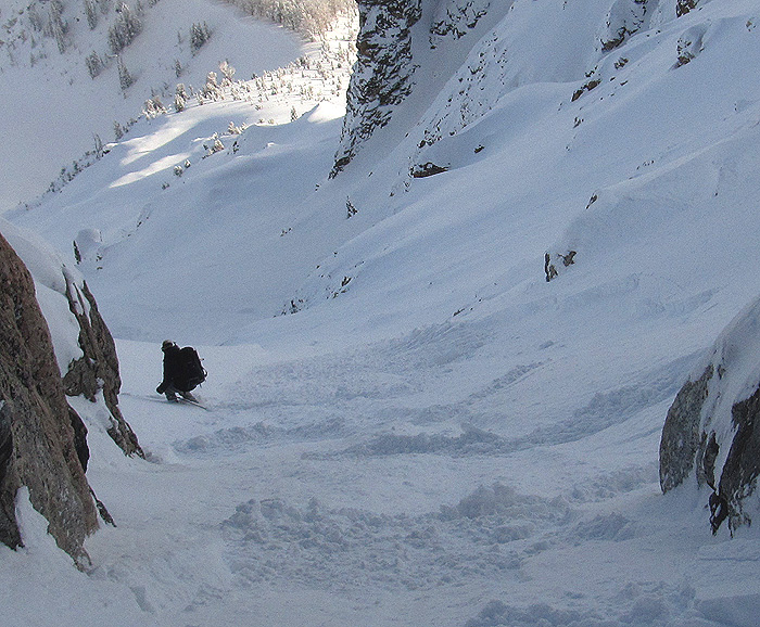 This tour was Brendan’s idea, so he skis first. The skiing and snow looks fantastic as he links slow turns to a point where we can see down more of the face. I ski down to meet him. The slough gets moving quickly and reminds us the we will need to be on our toes for this one. We inch down some more, towards the “Narrows” and Brendan leads the way to a stance where we can check out things better. A ski through is a no-go and he digs around a bit until some cracks in the rock for an anchor are found. It’s a short rappel back to skiable terrain, but the rope and rappel, instead of down-climbing, is welcome and almost relaxing.
