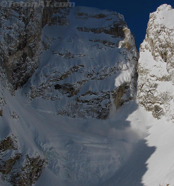 Although it is warm(ish) in the sun, we are in the shade for a short bit and our hands instantly freeze up from the cold. I lead the way to the top of the moraine through some great looking snow. It’s usually wind hammered or sun effected here, so it’s nice to see, but we aren’t skiing down this way, so we keep heading up. Some spindrift comes off the north side of the Grand Teton, as well as the Grandstand, and we watch it like our favorite YouTube video.