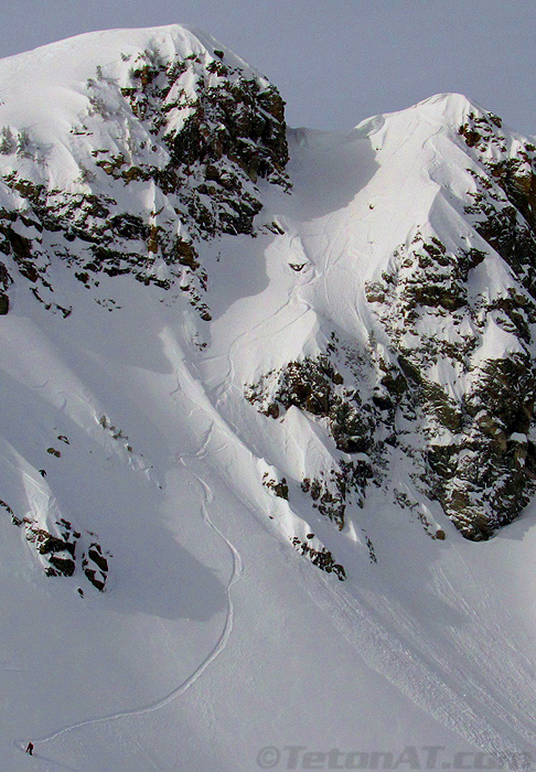 At this point, I was hoping they were going to drop into Static Draw, allowing me the opportunity to still get first tracks down the gut, but they stayed high and traversed east, back to the saddle just north of the summit. I motored over to the saddle, thinking maybe they would have sympathy on me and allow me to hit the gut first, since they just scored the north couloir. I was also kind of wondering who it was and it didn’t really surprise me when it turned out to be Jason Tattersall and Jesse Thompson.
