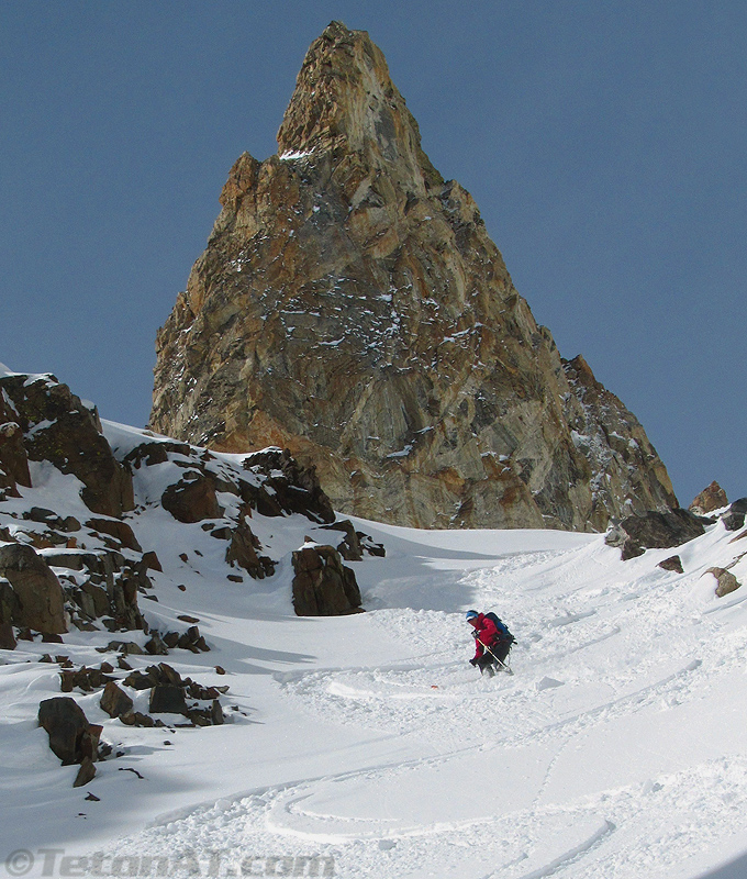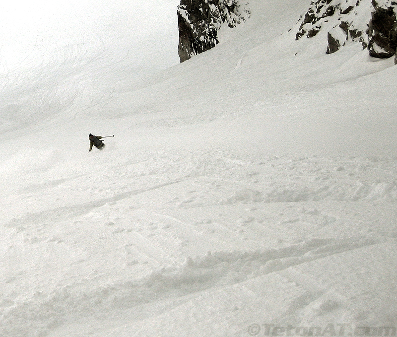 Thanks for breaking trail, I was in the party behind you, there was another party behind us too. I think a total of 8 people skied that line that day. The snow was blower so i think a good choice was made, I thought you might have been the one that put the skin track up the southwest on teewinot that day, I saw about 4 switchbacks in the actual couloir. Great day to be in the mountains!