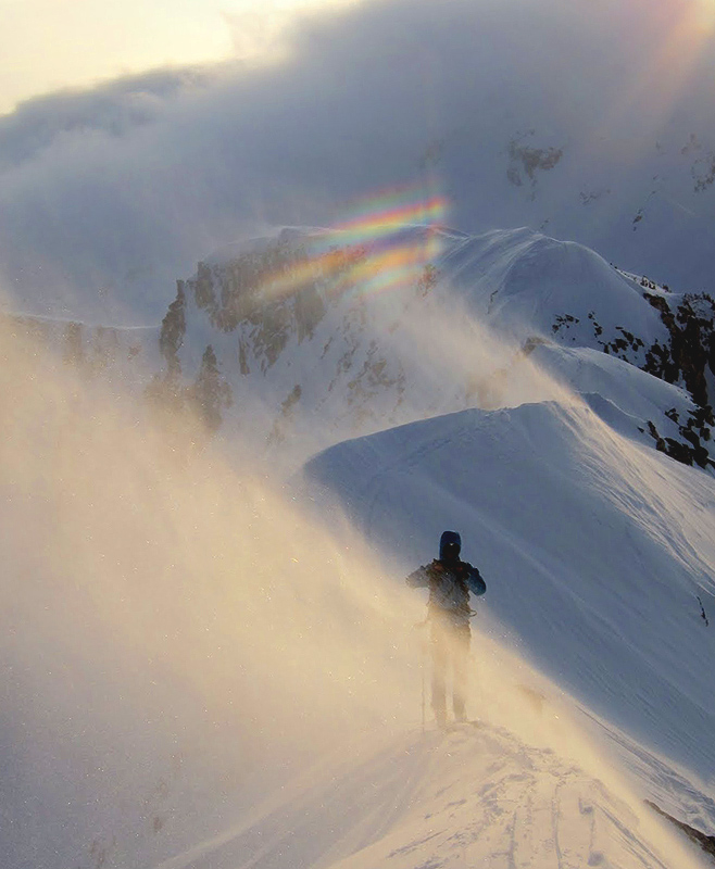 – Collective Gear: lightweight skinny skis, tech bindings, Whippets, minimalist harnesses, 60 meter 6mm cord, tat, a few nuts, a few pins, and 1 ice tool.
