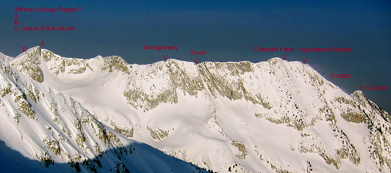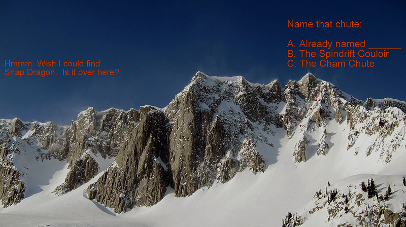 If it’s not yet obvious, one of the recurring themes of the day was the Snap Dragon. Where is it? I think my partners were a bit annoyed with my Snap Dragon fixation. Surely, the Cham Chute was a decent substitute, but I would like to find and, one day, ski Snap Dragon. Help, anyone?
