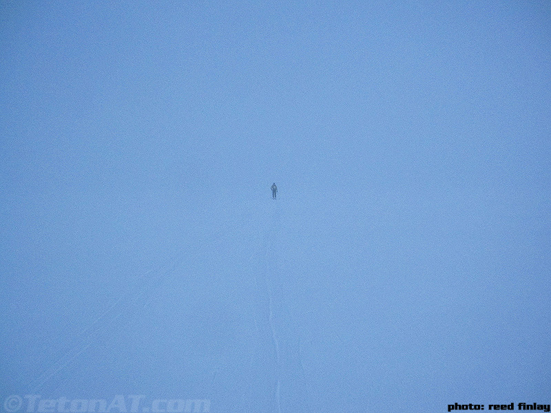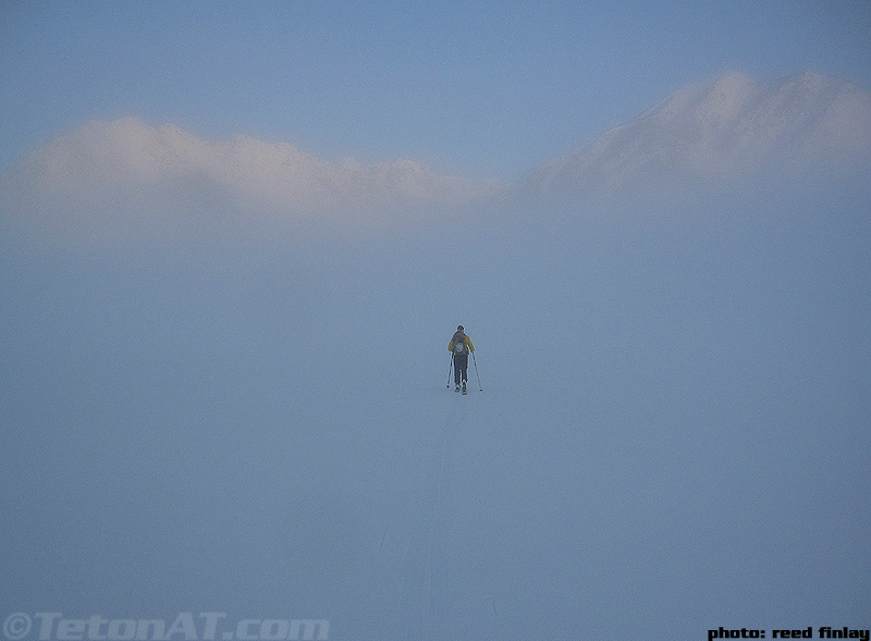 Reed Finlay heads towards the fog layer on Jackson Lake