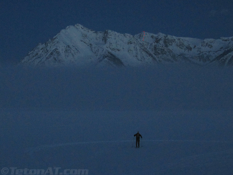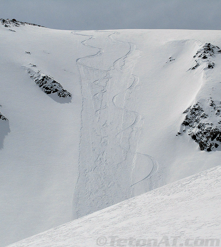 Yeah, I’ve got a hit-list of ski descents that I want to get done, but sometimes you need to act impulsively and go with the flow and not have tunnel vision focusing only on those objectives. That being said, while crossing Jackson Lake and coming back from a tour in Quartzite Canyon the other day, I noticed a line that was illuminated by the afternoon sun. It looked quite aesthetic and centrally located in the heart of Waterfalls Canyon. When I got home, I scoured my collection of photos from previous tours, found some good images of it and knew, I just had to ski it….soon! With the snow and weather conditions kind of questionable for most descents on my hit-list, it seemed like the perfect time to go for it.