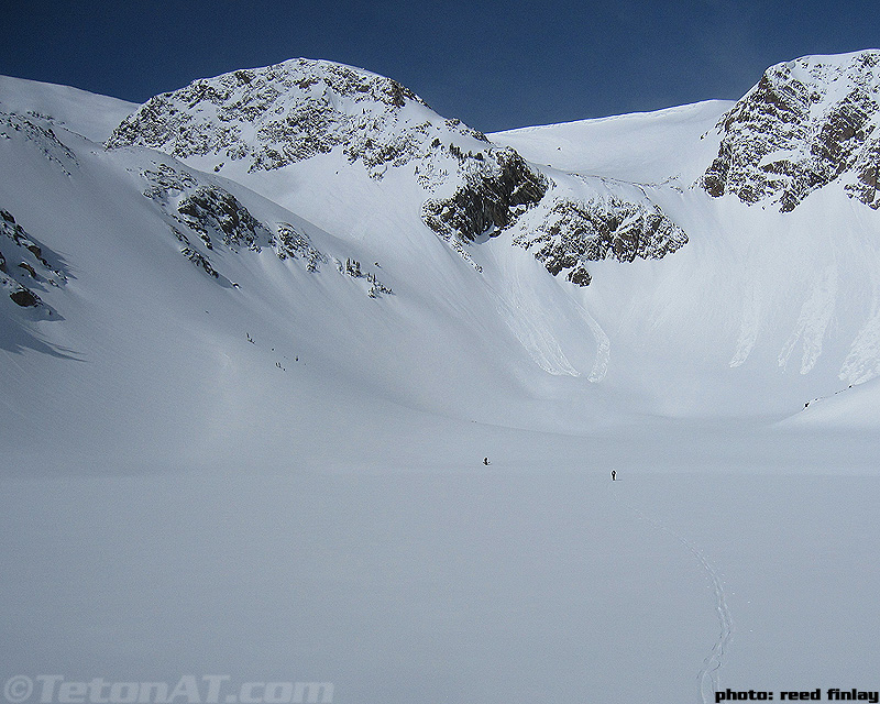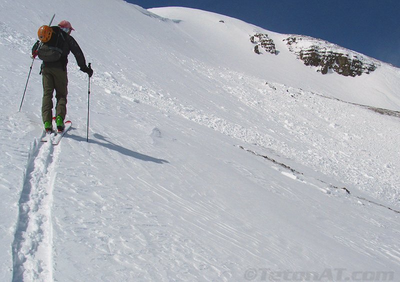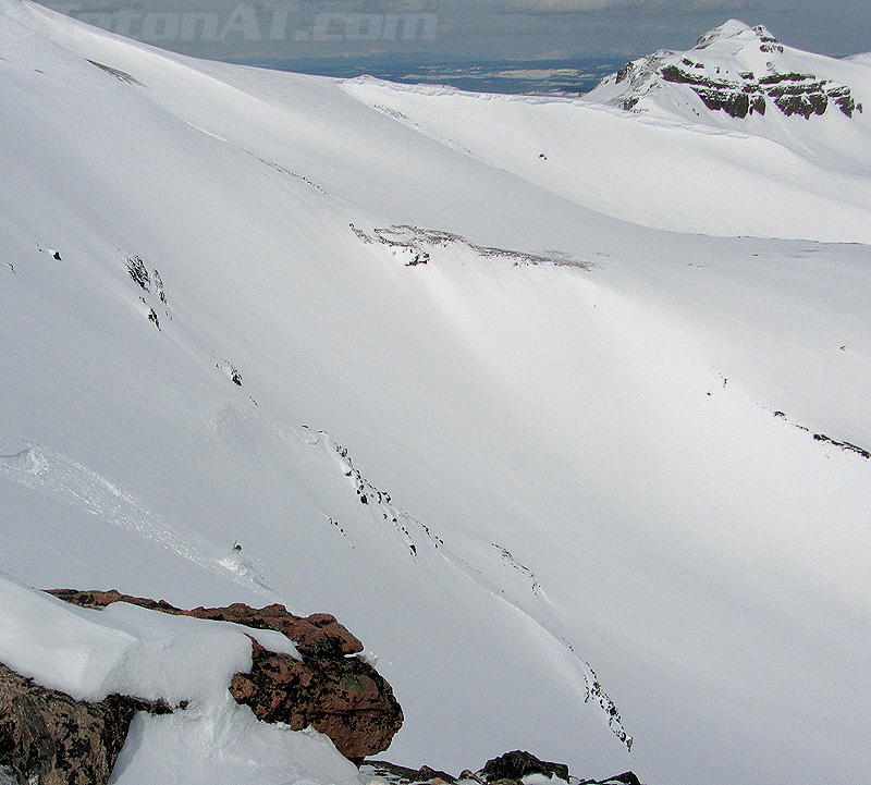 Reed scopes out some recent avy debris below the summit of Doane.