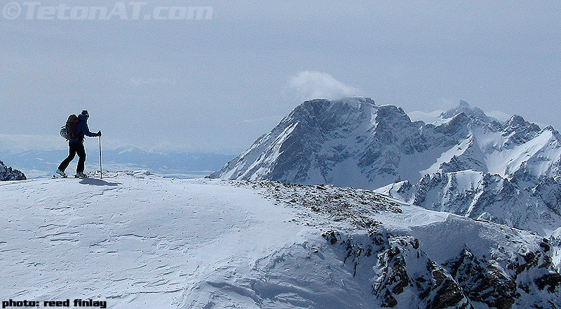 Reed skis in front of the North Couloir of Eagles Rest Peak.