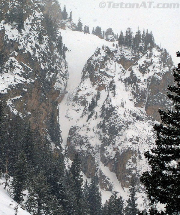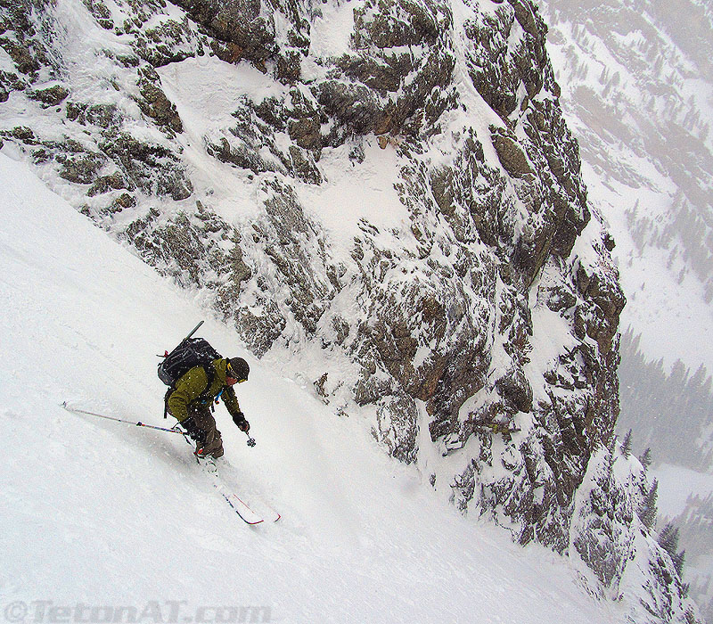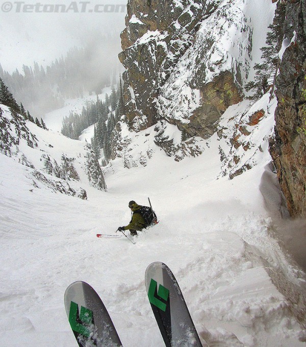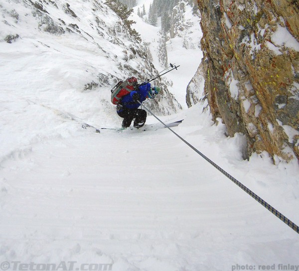 I’ve heard this run called numerous things, like Ulnar Collateral Couloir, Broken Thumb Couloir and/or Doc’s Thumb. The thumb reference is because during one of its descents, this local dude whose nickname is “Docâ€, aired the crux and broke his thumb in the process. I’m not totally sure how much the crux of this line ever fills in, but even though we have had such a big snow year this year, it was still rather spicy and we employed a rope to sneak through it. Here are some photos.