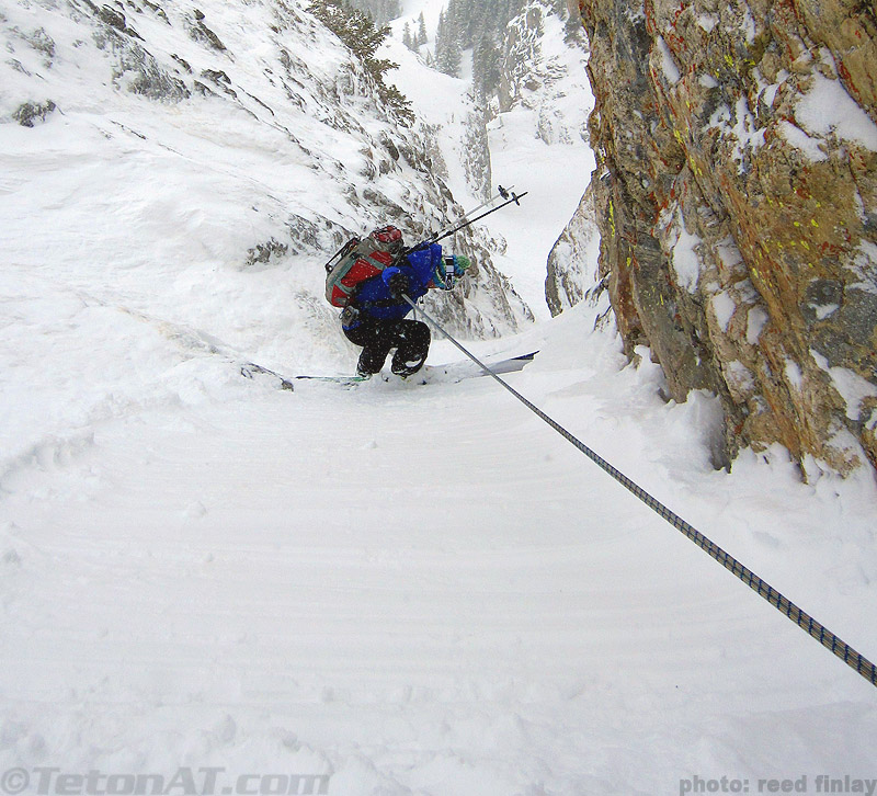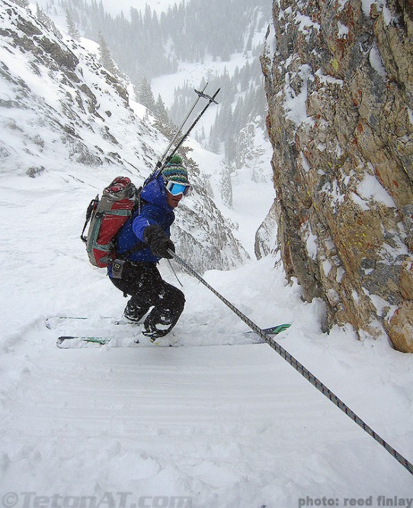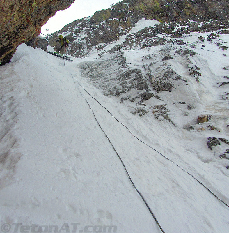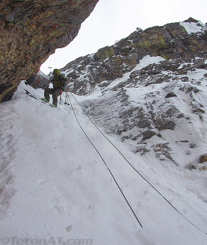 Randosteve uses a hand-line to get through the crux of the couloir.