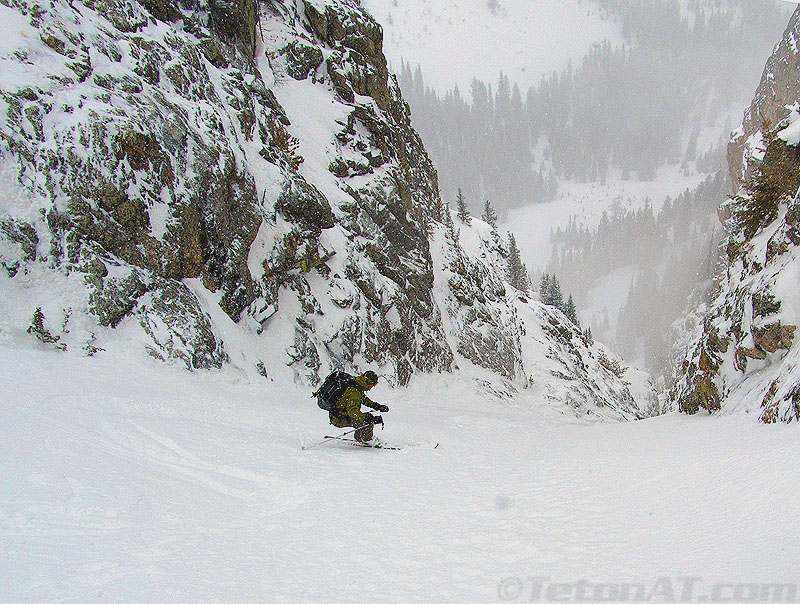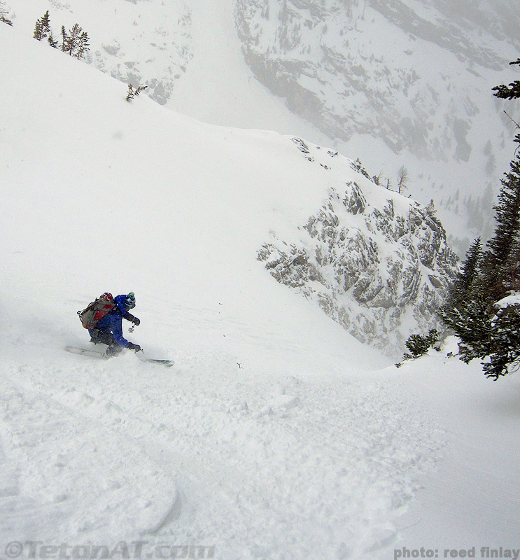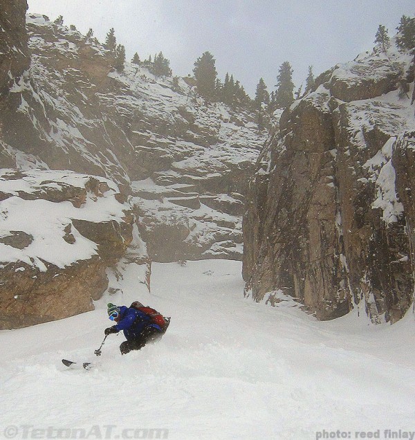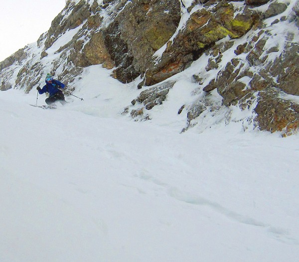 Reed skis the main ramp section of the descent, with 4-Hour Couloir