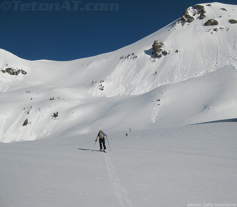 With the warmish temperatures we’ve been having lately (both day and night) and shallow freezes in the snowpack, it’s no wonder there seems to be little skier traffic in the hills recently. Low and behold though, our now historic snow-pack is starting to consolidate and there is some good skiing to be had…you just have to get up early to enjoy it. Higher elevations (above 11k’) still seem to be providing punchy bootpacking for the time being (and probably still shedding some snow), but the skinning/skiing is supportable and generally good if you time it right.
