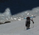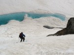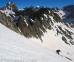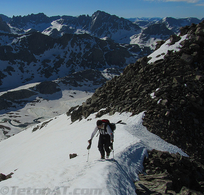 Most of the lines on my Winds “hit-list†require better conditions than what can be expected in mid July, but it was still fun touring and skiing around the Titcomb Basin area and Mount Helen (WY 5th highest) and another random peak nearby. There is still a ton of snow in the Winds above 10.5k’, though there are some near penitente sized sun-cups on the flats, which can make skinning and walking rather interesting.