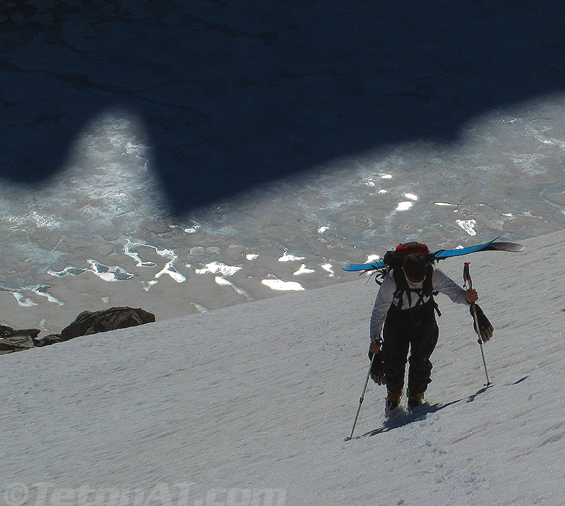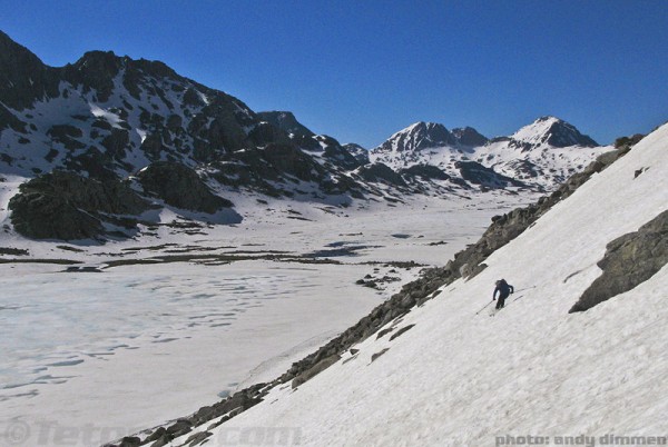 The next 4 miles were mostly snow covered, with dry patches here and there. We opted to keep walking and our feet got soaked in our tennies as we post-holed and sloshed through water submerged trails and creek crossings. It wasn’t until we reached Seneca Lake that we started skinning, and then it was mostly smooth sailing (relatively speaking) the rest of the way. I was on my lightest setup, 175 BD Guru skis w/ Dynafit Titanium bindings (discontinued) and TLT5 Performance boots, which made the last five miles of skinning with the heavy pack on almost enjoyable.