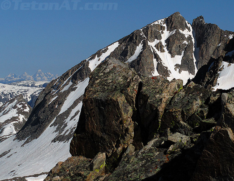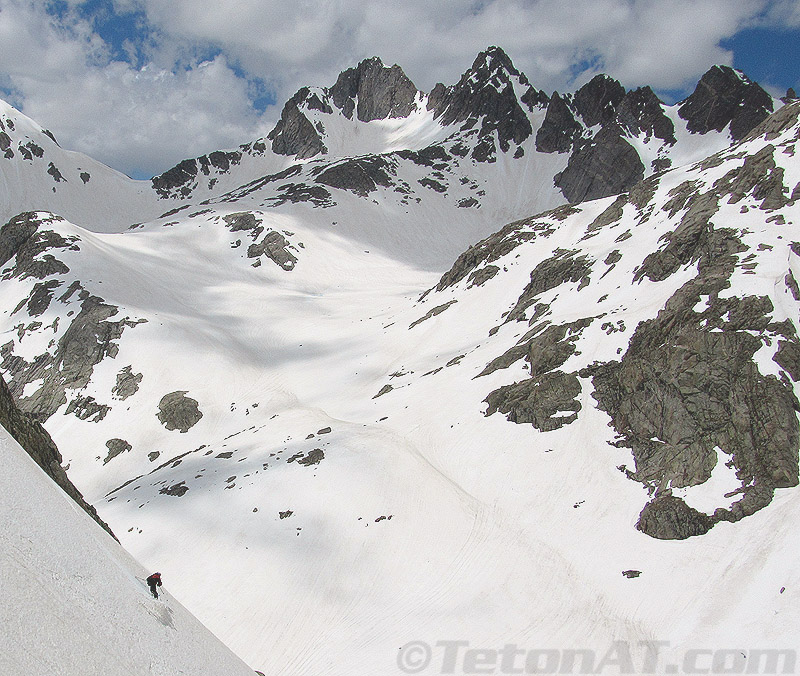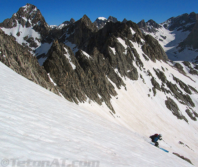 We got up with the sun the next morning, not in too much of a hurry, and made it out of camp just after 7AM with our eye on an east-facing line right next to the tent that already was getting the sun. The cramponing was easy on the firm snow and we gained elevation quickly. Hitting a ridge, we continued on towards the summit and enjoyed stellar views of classic Wind River terrain, as well as the Tetons in the distance.