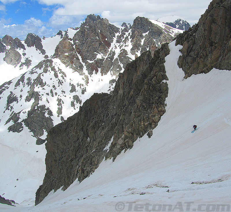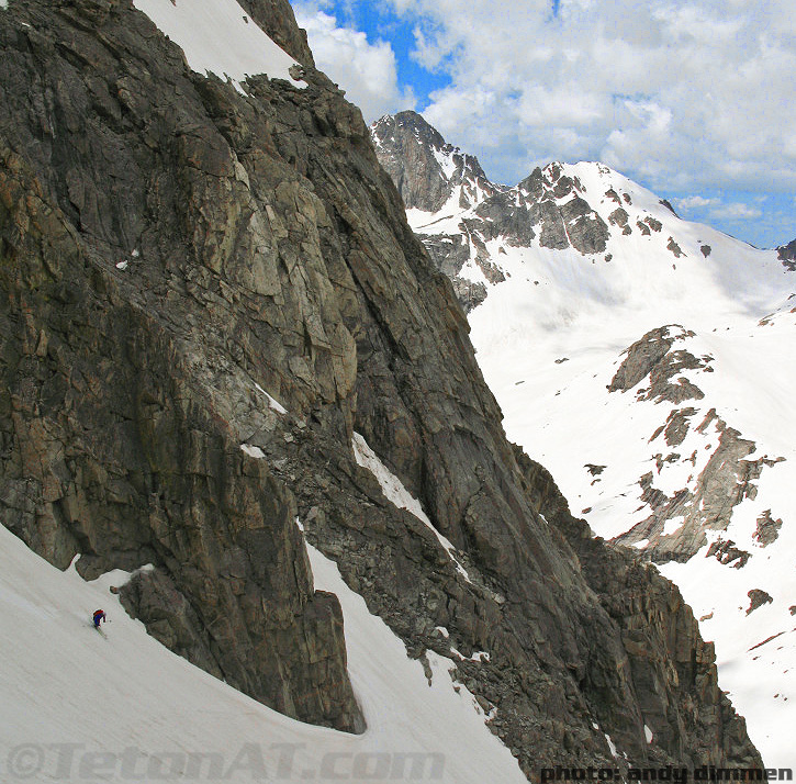 A few falling rocks in the couloir kept our focus looking upward and I was glad I had my helmet on. The wind kicked up as we neared the top of the couloir and my body was starting to feel the miles and vertical. The rest at the top felt good, but the wind kept it short and we were soon skiing. After the top few hundred feet, a large runnel forced you to choose one side of the couloir. I went left, Andy…right.