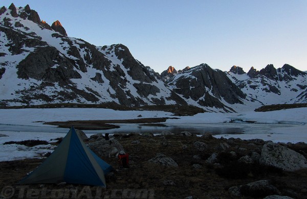 The basin lakes were frozen, but the sections with running water at the top and bottoms of the lakes were melted out, which made getting water easy. We camped in between the lakes and slept well, regardless of how loud our pyramid tent flapped in the stiff breeze. Old tracks in the snow don’t last long in the heat of the summer (we could barely see our entry tracks two days later on the way out) but it looked like there may have been someone in the area about a week prior…going for Gannett.