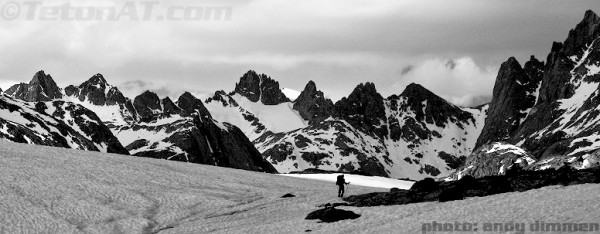 Andy Dimmen skins in Titcomb Basin of the Wind River Mountains.