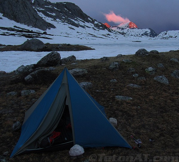 Surprisingly, the slog back to camp wasn’t too hot. With the sun reflecting tall granite walls and snow covered slopes surrounding the basin, it can often feel like a furnace this time of year, but the wind and cloud cover kept things comfortable. An hour or two after arriving at camp, the clouds grew and finally rained on us, forcing us to take shelter while the thunder cracked above as well. The storm broke just before sunset, which gave us time to whip up some dinner outside as the peaks and cloud turned red.