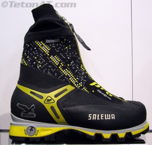 Another cool and interesting product at the Salewa booth was found in the new alpine mountaineering boot called the Pro Gaiter. The boot will be the first of its kind to offer a climb/walk feature located in the sole of the boot. By rotating a small dial in the heel of the boot, one can choose between a rigid sole for support when climbing on steep terrain, or a “walk mode†that allows the sole to flex a bit more, making a long walk or approach on flatter ground much more bearable. You could definitely notice a difference in modes when wearing the boot and I’m sure the boot only flexes more after the soles become “broken in” and more flexible.