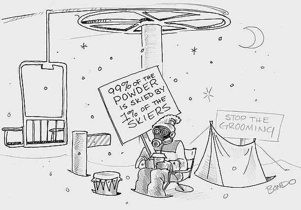 No more of you self entitled #occupy first chair dirtbags sleeping in your truck in the parking lot and expecting to get first tracks. I’m gonna roll up in my A6 wagon 15 minutes before the tram opens and have the man lauch a couple of tear gas cannisters to thin the crowd a bit so me and my Bogner fag bag wearing cronies can get first box. Then we can slay the Pow that we have paid for!