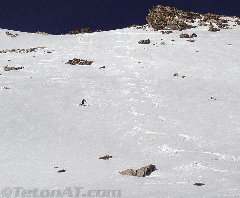 Though we found some very stable snow conditions, a snowboarder triggered a large slide while attempting to ski Pucker Face on Cody Peak outside of the backcountry gates at JHMR yesterday. (Click here for a close-up image of the slide.) This shows that there is some serious variability in snowpack stability right now, so choose your line wisely.