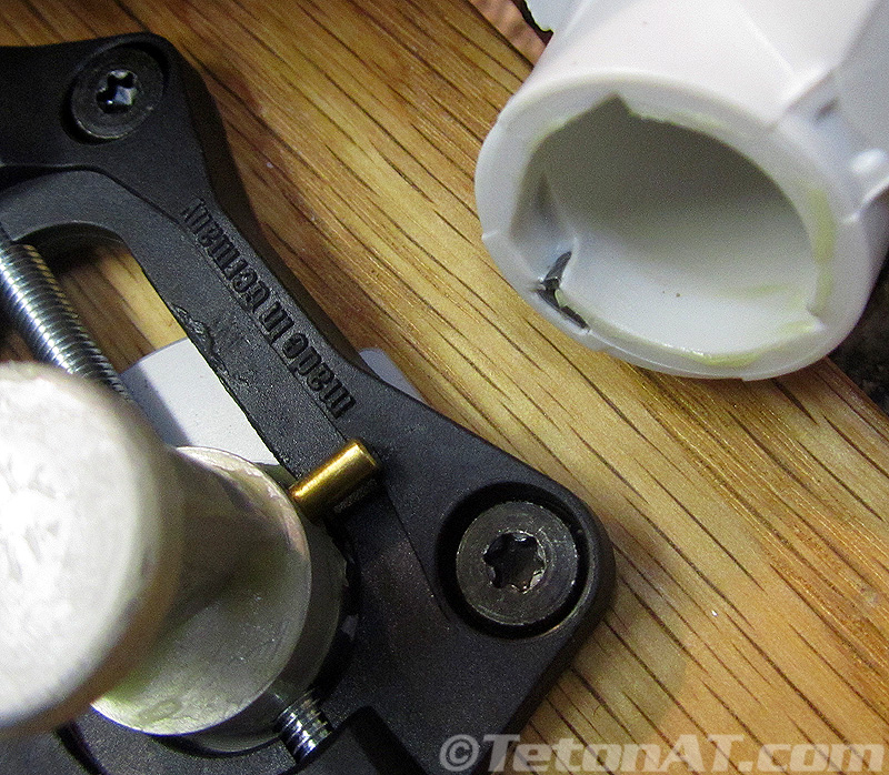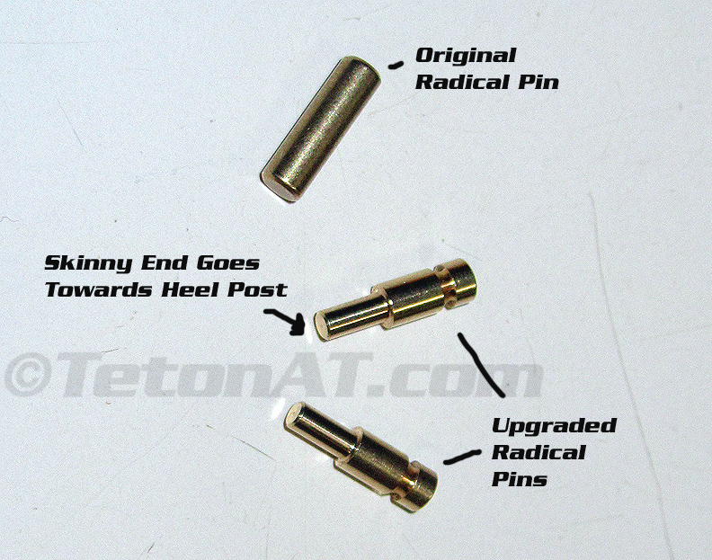 Alas, after a couple weeks in limbo, Dynafit has now released the new Radical binding heel-pin upgrade. The pin is made of brass and has a skinny end, as well as a think end with a small ring indented into it. When installing the new pin, the thin end goes in, towards the heel-post. I’m not sure what the indented ring is for, but it may add a bit of bite to the lock-out feature or be some sort of break-off point so as not to damage the plastic housing. All-in-all, the new pin is reported to decrease the amount of force it takes to spin the heel-piece in a counter-clockwise motion and over-power the auto-rotate lock-out feature of the Radicals.