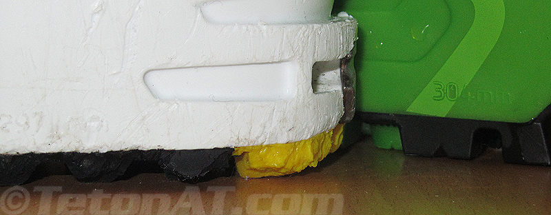 The sole of the Vulcan has two nubs/posts/round protrusions in the toe and heel area that work in conjugation with the AFD plates on “rail-type” AT bindings (Duke, Freeride Pro) to allow for a smoother and more consistent release out of the binding. Since the TLT5 doesn’t have big enough welts on the toe and heel to be compatible with these type of bindings, they are not needed.