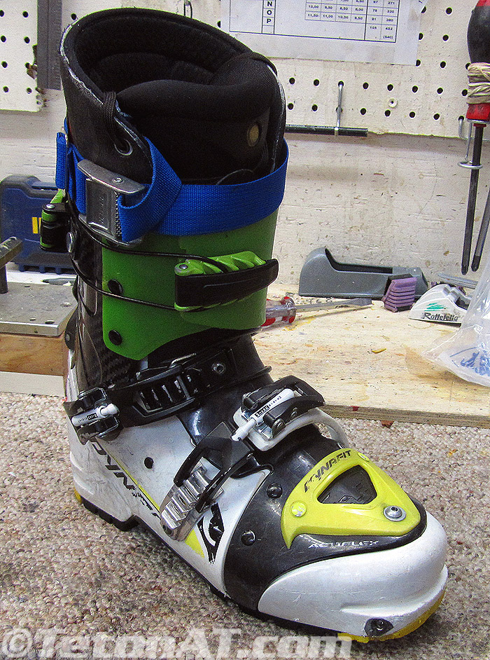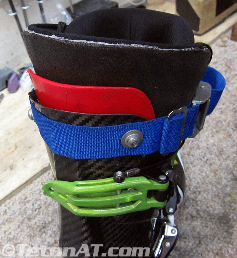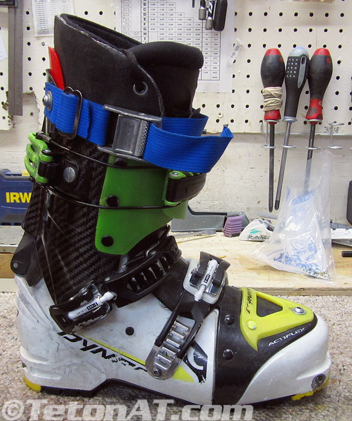 The upper green plastic is from some Z-zeros. Thicker and stiffer than the stock plastic of the TLT5’s. The instep buckle has been relocated to the cuff rivets with some Technica hardware, if I recall. I can’t quite remember what the white plastic of the bottom buckle is from. I’m sure those that are more familiar with current alpine boot offerings can chime in on that one.