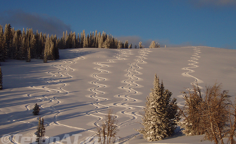 When relating to skiing, some people call it “trenching” when you leave deep ruts in the corduroy as you rail GS turns down the piste. Others, myself included, consider it “trenching” when you ski really deep and light powder (on skinny skis?), and you leave deep and wide trenches in the snow. Never-the-less, the snow and skiing have been sweet here lately, and although the terrain I’ve been skiing has been a bit meadow-skippy…I have definitely been trenching it. 😉