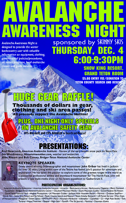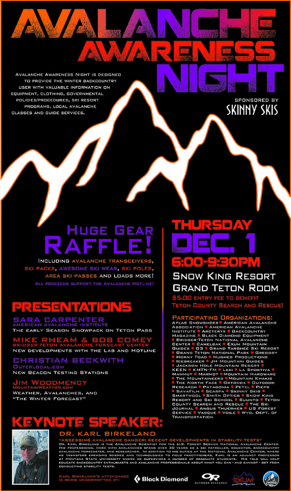 It’s that time of year again, and the Skinny Skis Avalanche Awareness Night is this Thursday, December 1st, from 6-9pm in the Grand Teton Room at Snow King. (Details below.) This event has become quite huge over the years and this year it is slated to be better than ever. Our guest speaker is Karl […]