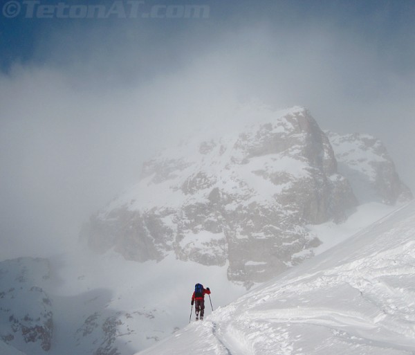 Over the weekend, I skied Peak 10,696 in Grand Teton National Park with Randokitty. The weather was pretty burly, with wind gusts close to 70mph that day. The skiing was halfway decent, when you could see, and Kitty got blasted by a huge wind gust on her descent.