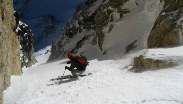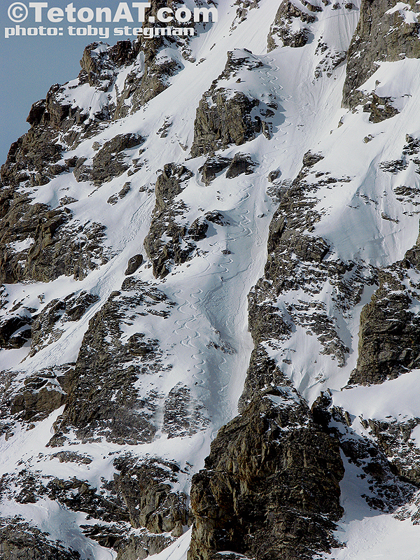 Randosteve skiing the Chouinard Couloir on the Middle Teton. Photo taken by Toby Stegman from West Hourglass Couloir on Nez Perce. Click here for a video from the descent.